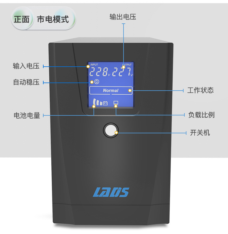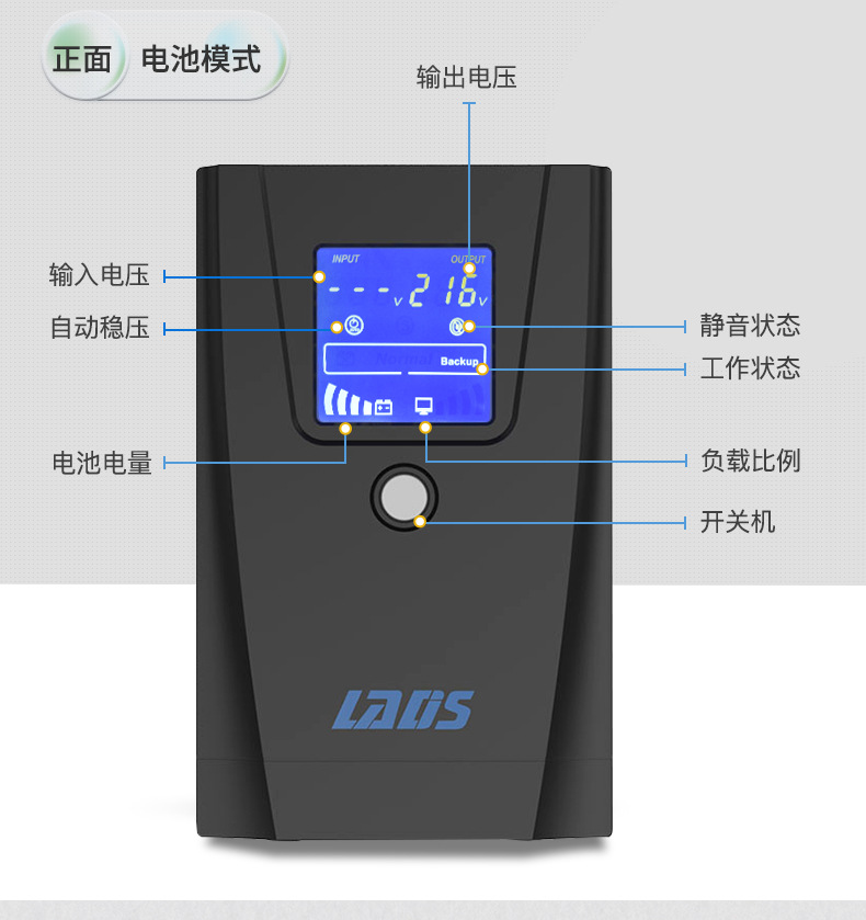 | LCD | LCD液晶显示屏,显示输入、输出电压,电池电量、负载大小,市电电池供电模式 | |