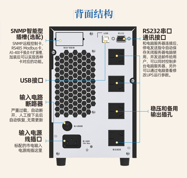 | 过载 | 100%~110%: 只发出警告音 110%~130%: UPS 在电池模式时会在 60 秒后自动关闭, 或在输入正常时切换到旁路模式。 >130%: UPS 在电池模式时立即关闭,或在输入正常时切换到旁路模式。 |