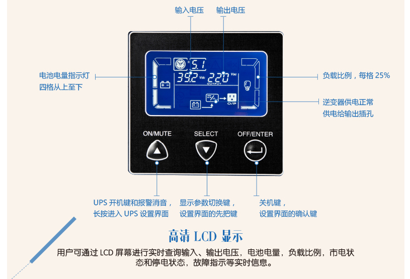 通过逆变器输出给负载提供稳定干净的交流电源,输出电压波动在±1%,不受输入电源的影响,保障各种设备安全稳定的运行。