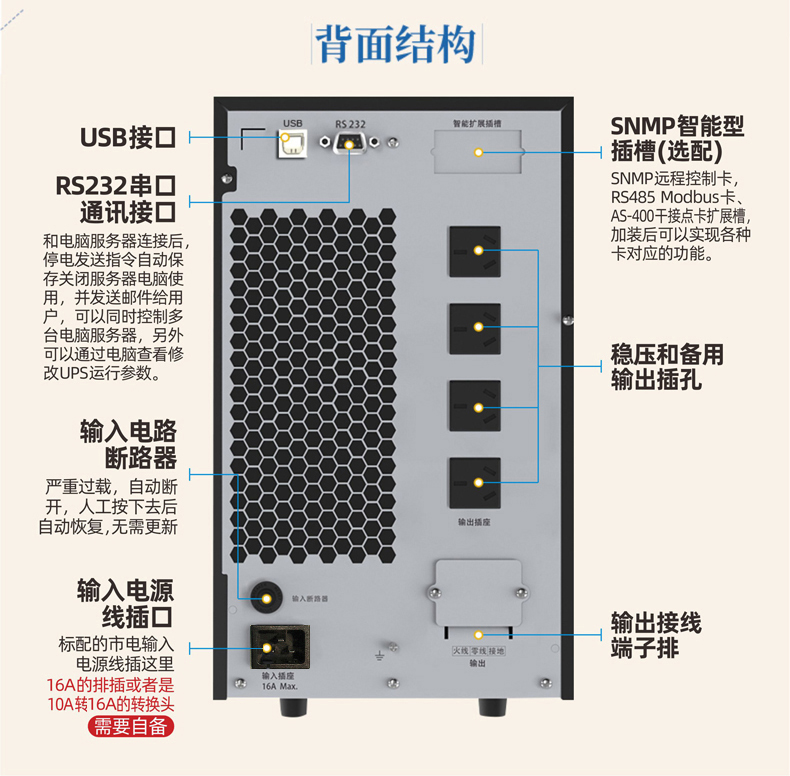| 过载 | 100%~110%: 只发出警告音 110%~130%: UPS 在电池模式时会在 60 秒后自动关闭, 或在输入正常时切换到旁路模式。 >130%: UPS 在电池模式时立即关闭,或在输入正常时切换到旁路模式。 |