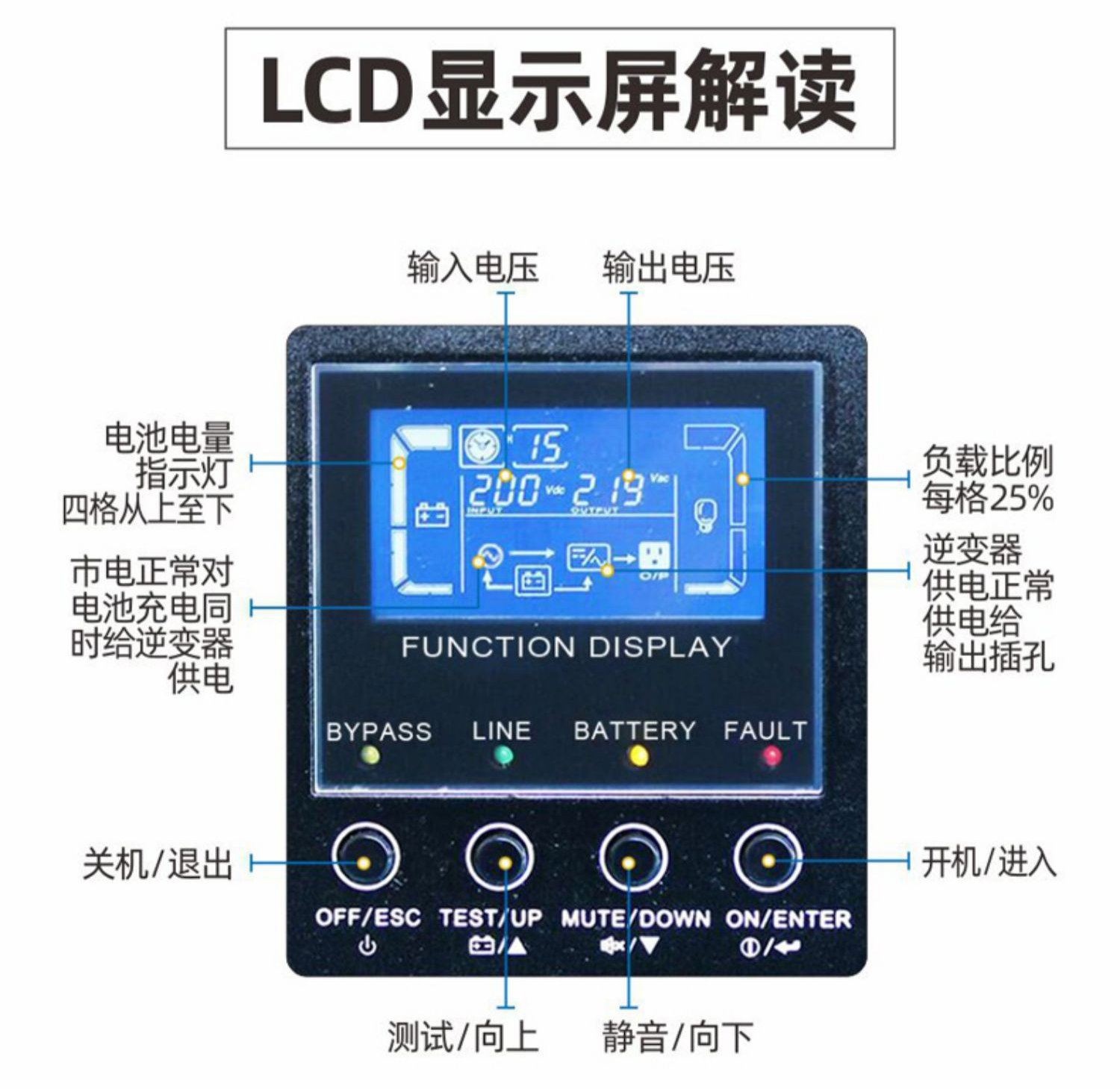 | 过载(市电模式) | 100%~110%:10分钟;110%~130%:1分钟;>130%:1秒 |