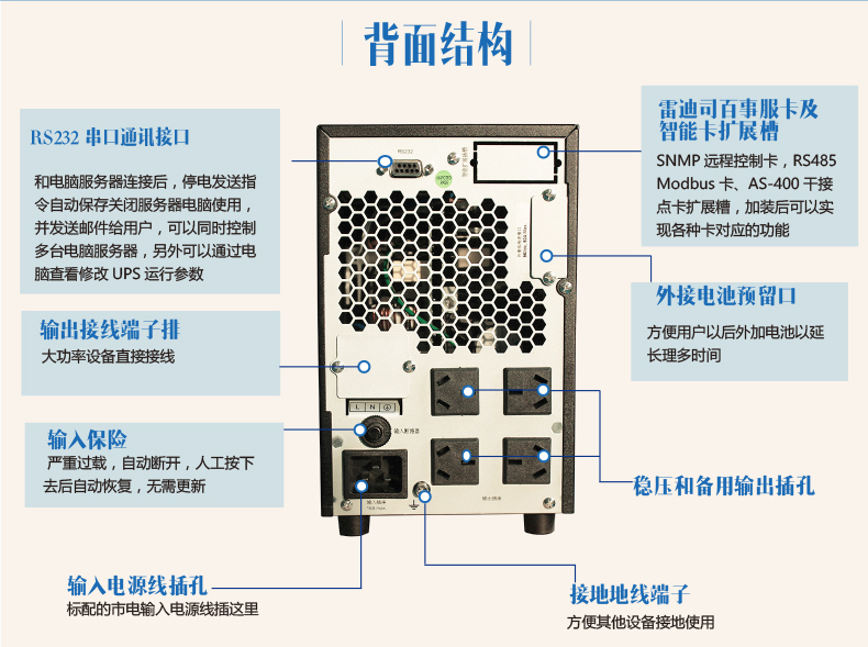外接大容量蓄电池,保证在停电后的零间断的给负载设备长时间供电。