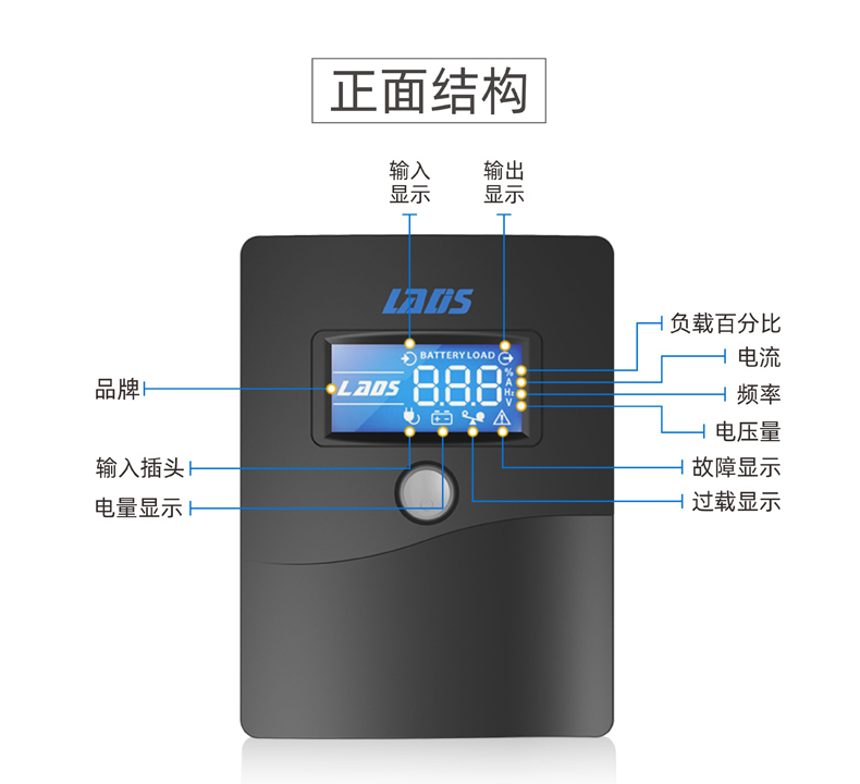 | LCD | LCD液晶显示屏,显示输入、输出电压,电池电量、负载大小,市电电池供电模式 | |