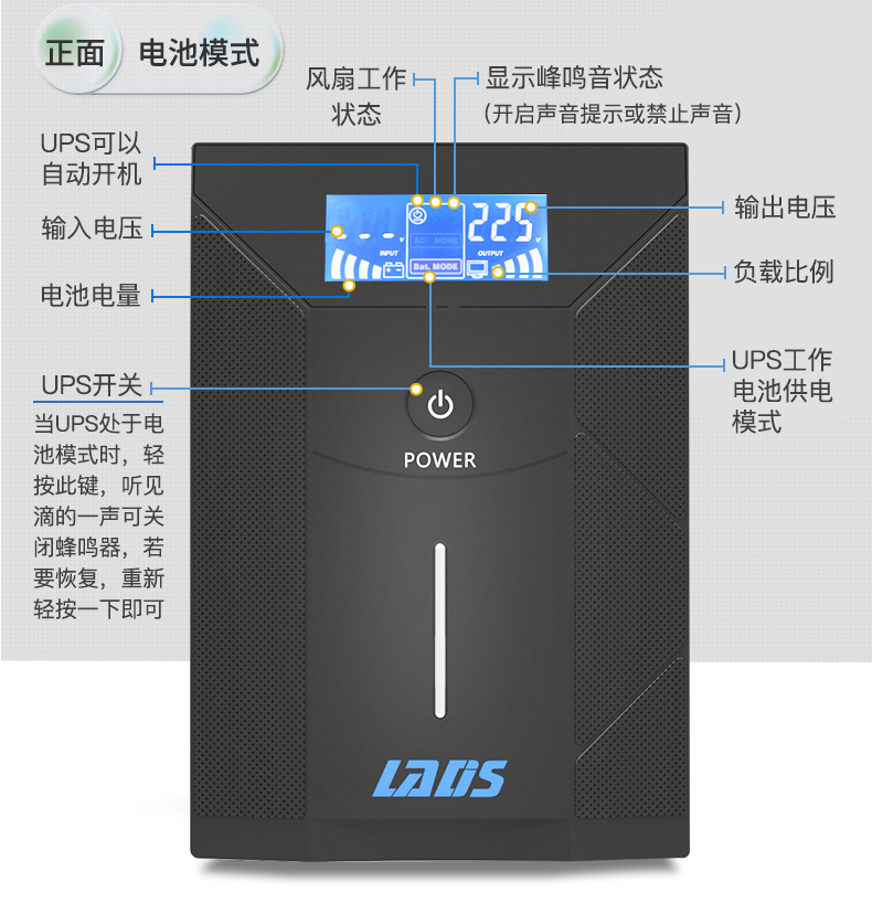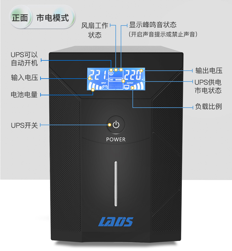 | LCD | LCD液晶显示屏,显示输入、输出电压,电池电量、负载大小,市电电池供电模式 | |