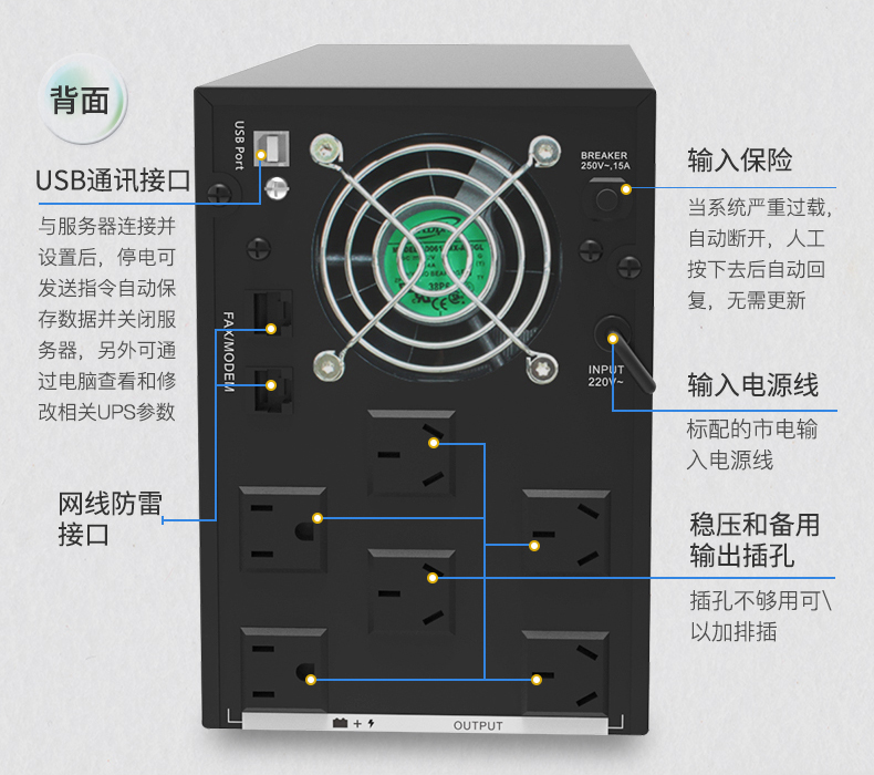 | 后备供电时间 | 单电脑使用120分钟,具体时间取决于电脑实际功耗 | |