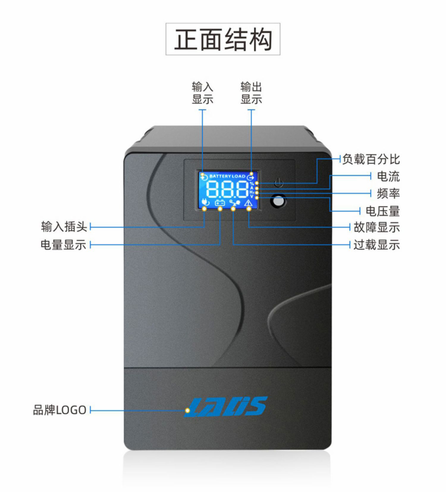 | LCD | LCD液晶显示屏,显示输入、输出电压,电池电量、负载大小,市电电池供电模式 | |