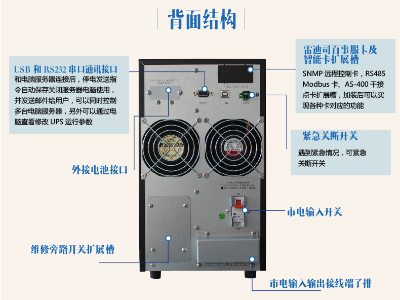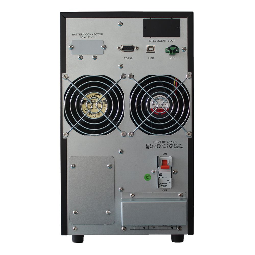 外接大容量蓄电池,保证在停电后的间断的给负载设备长时间供电。